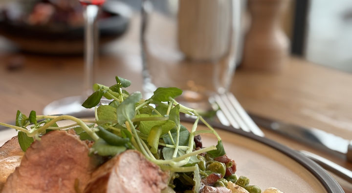 Til hovedret serverer vi saftig svinemørbrad, ledsaget af ærte francaise og en cremet røgeostsauce. Som tilbehør får du nye kartofler med smør og løvstikke, der fuldender retten med deres friske smag og sprøde konsistens.