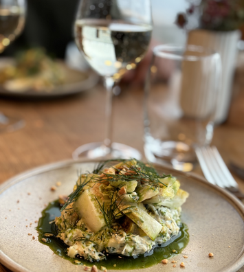 Forretten på vores Ragnarok-menu er en delikat krabbesalat, perfekt kombineret med grillet hjertesalat, sprøde ristede hasselnødder og en forfriskende dildolie. En smagsoplevelse, der pirrer dine smagsløg og sætter tonen for aftenen.